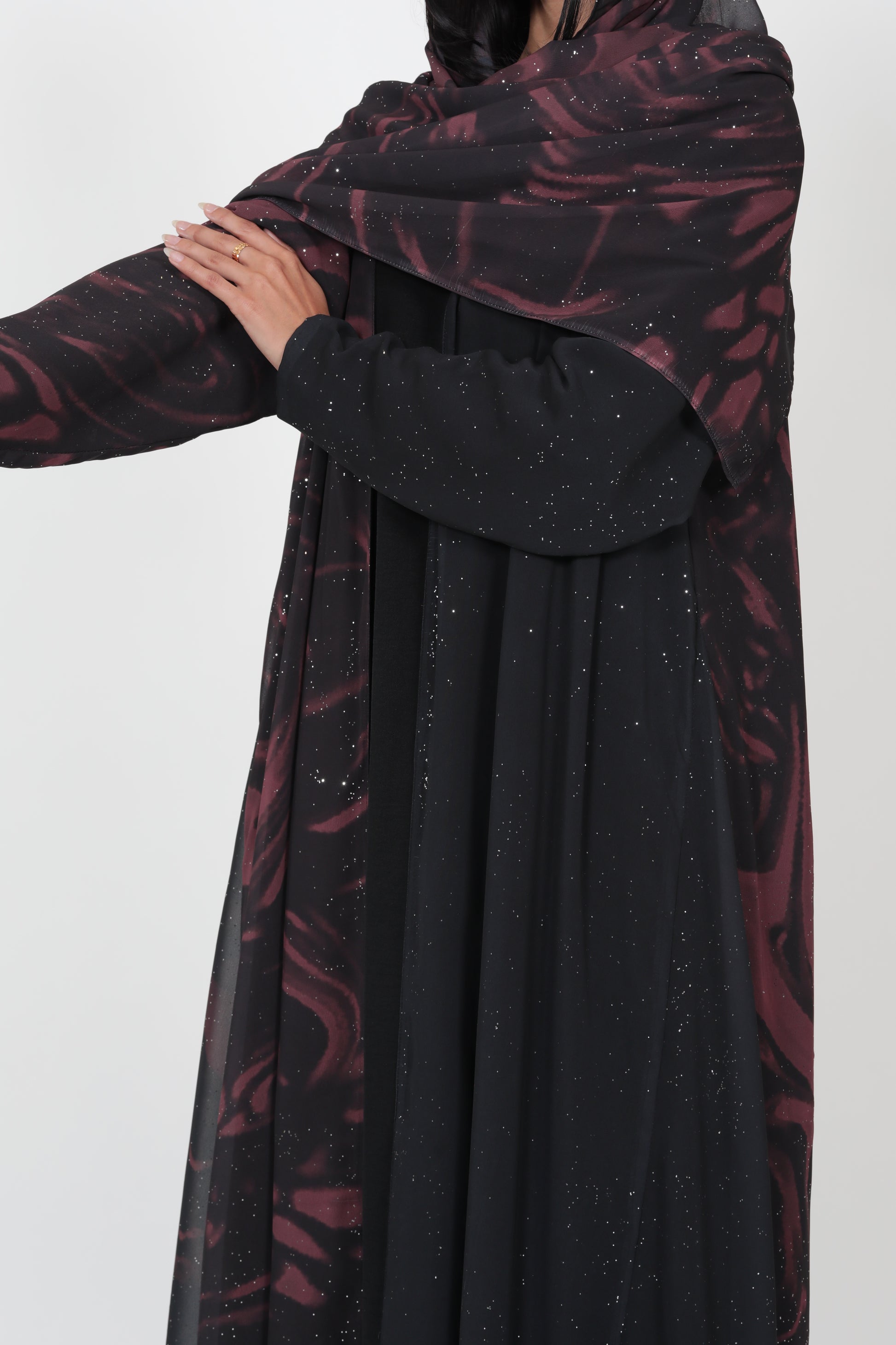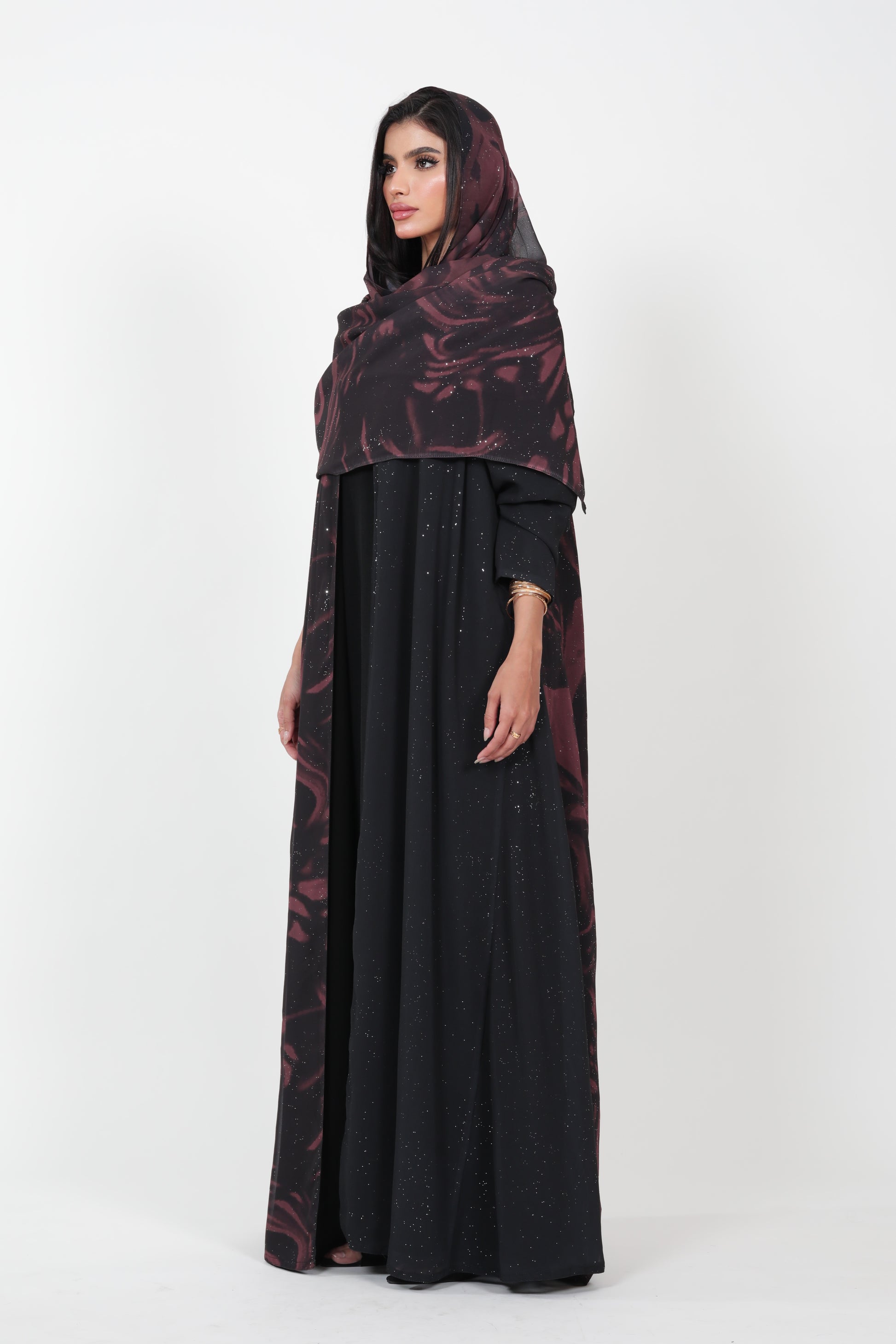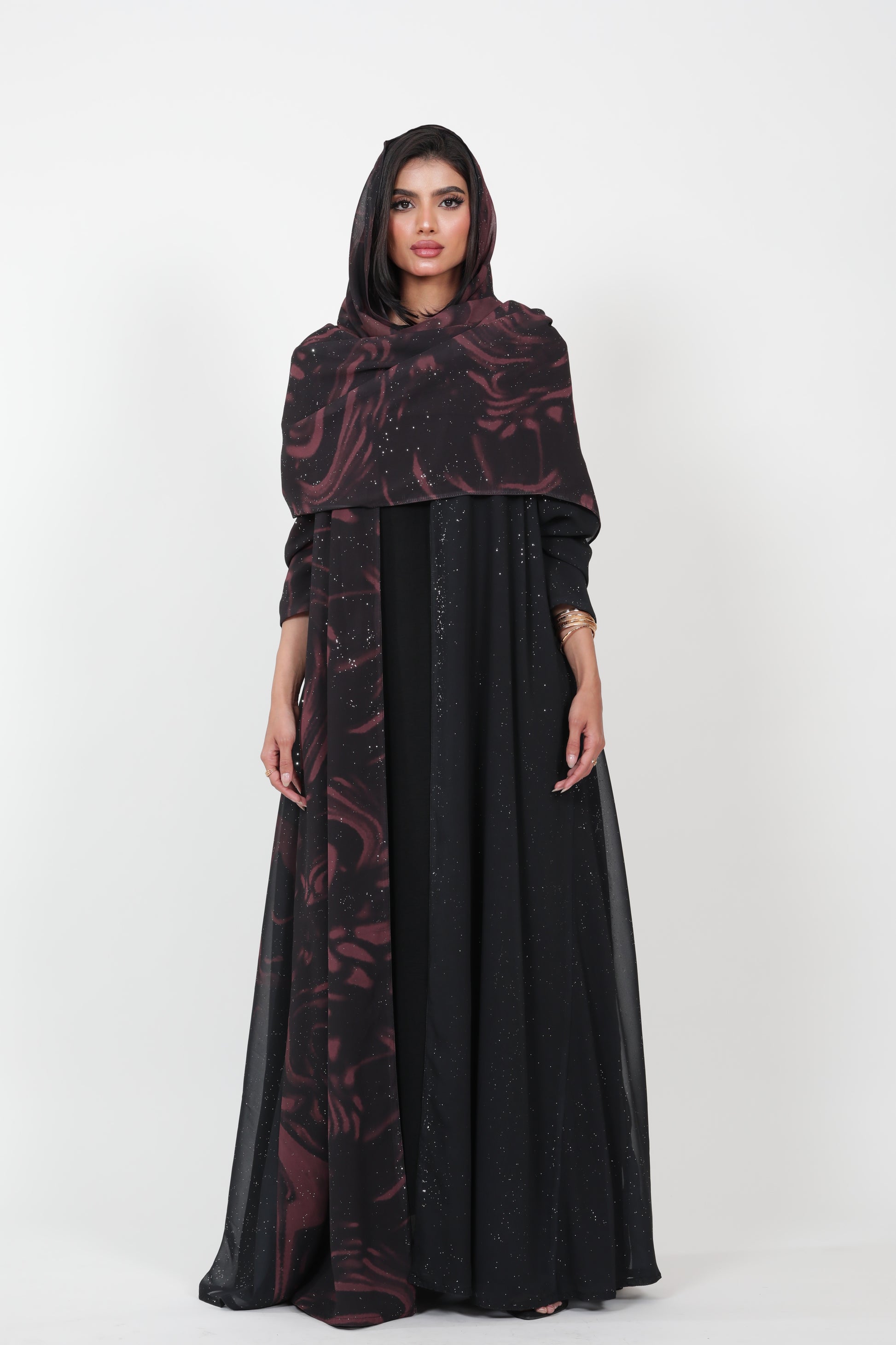 عباية شيفون مبطن بجودة عالية بنقشة أنيقة ولمعة خفيفة، مثالية للمناسبات والسهرات.