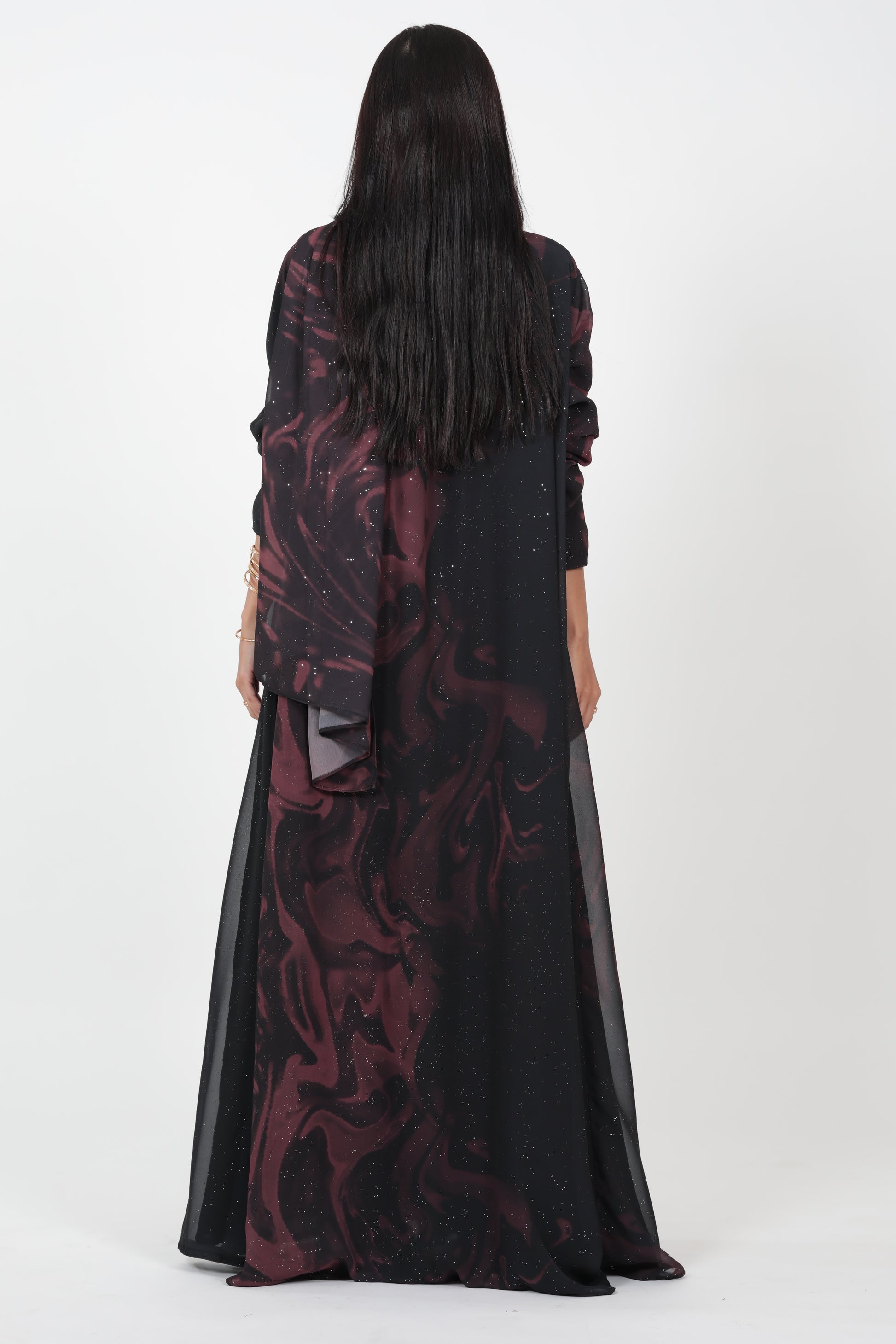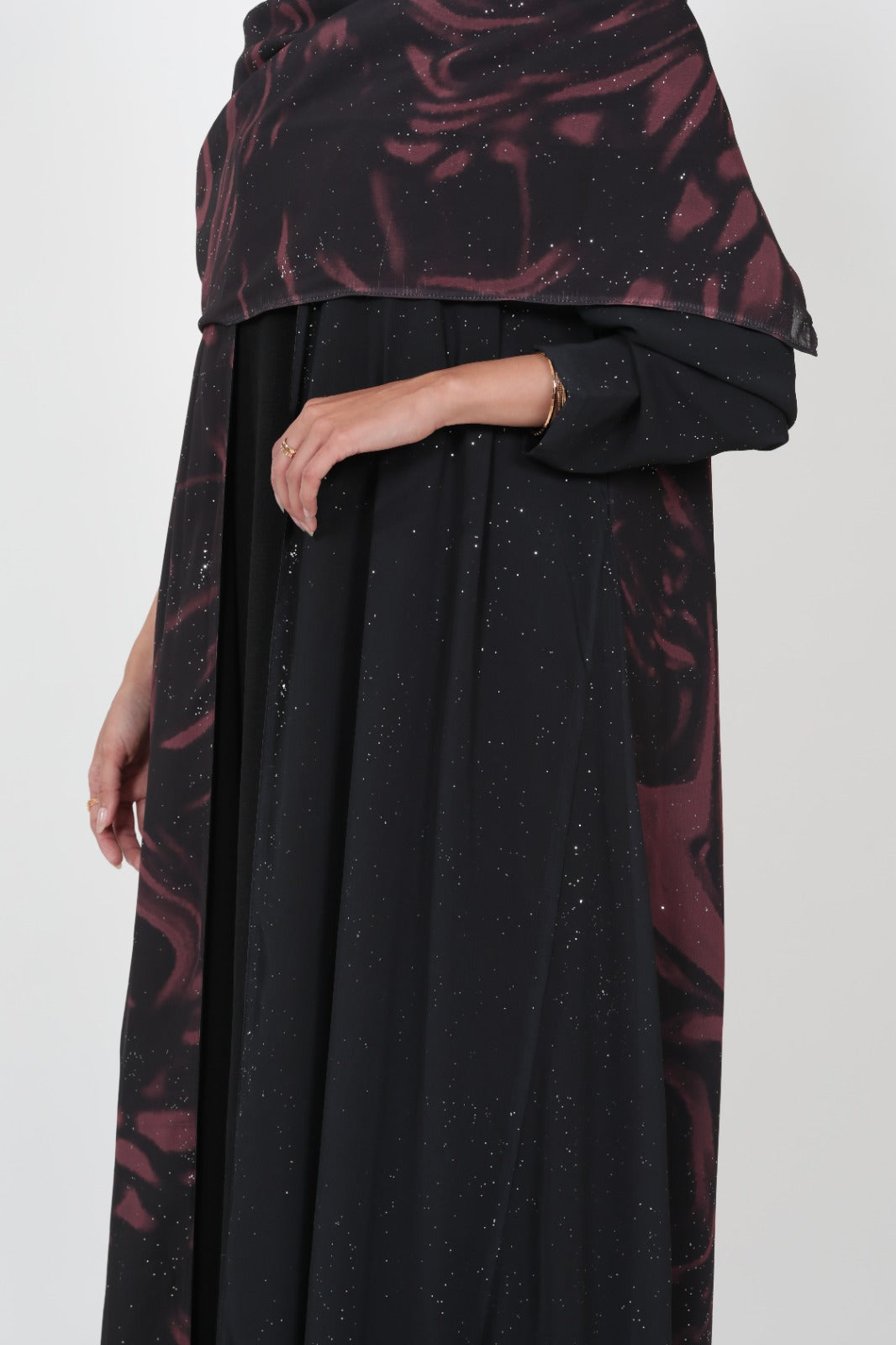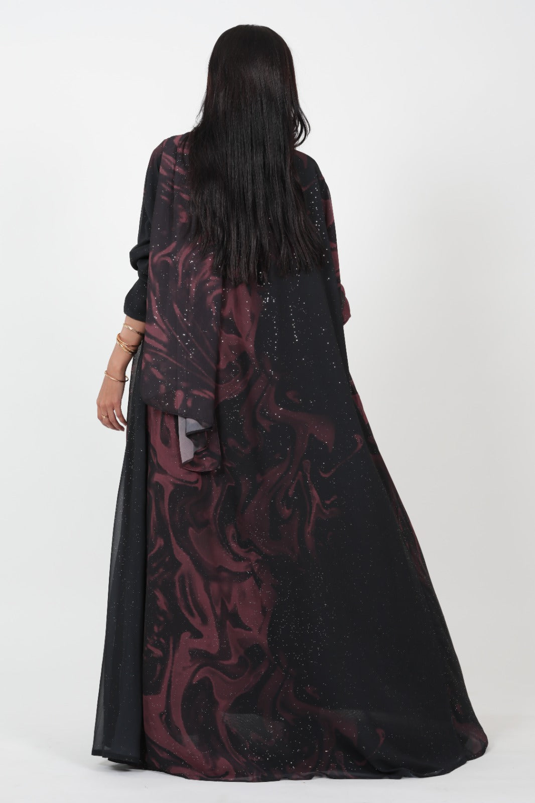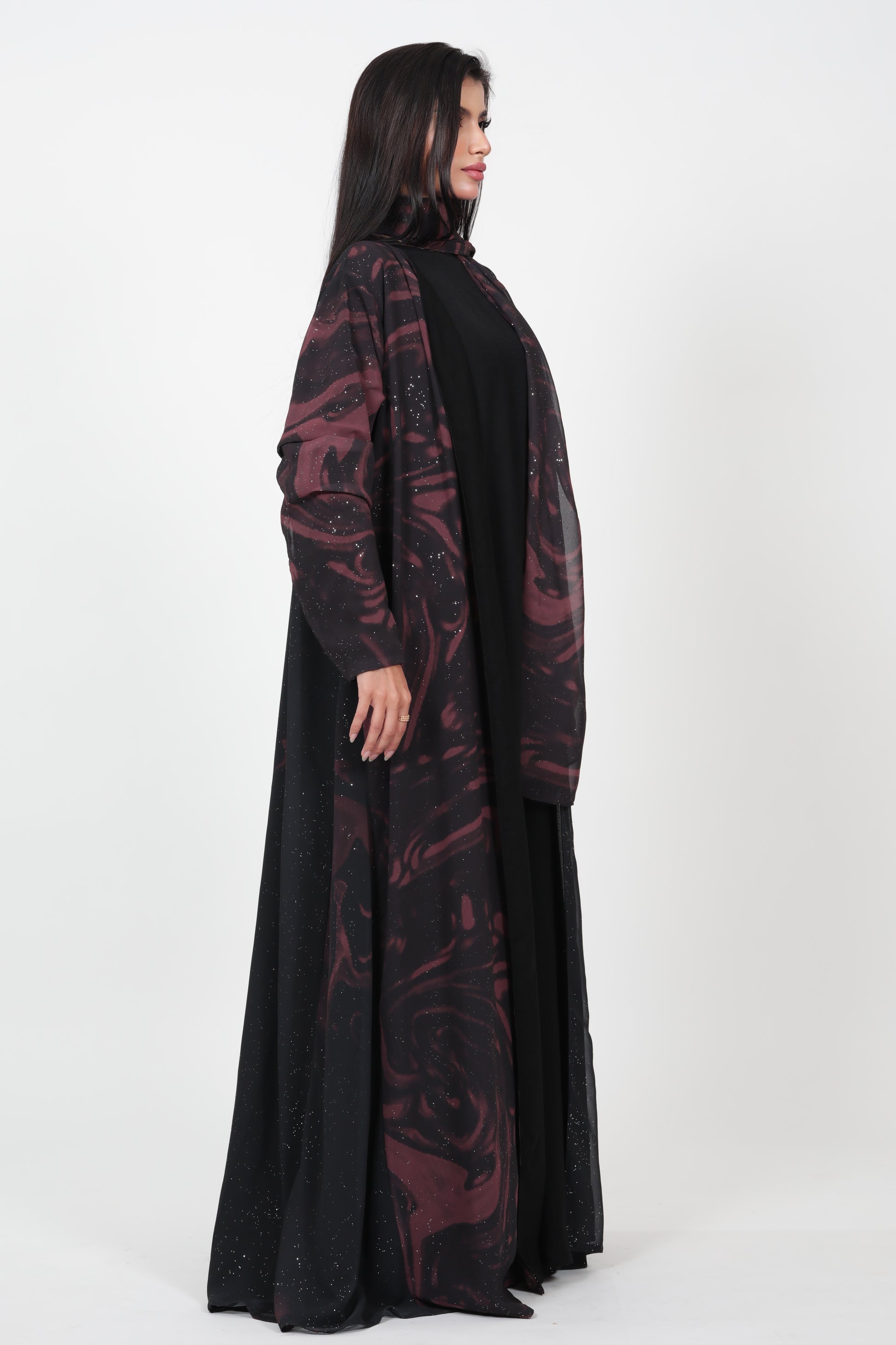 عباية شيفون مبطن بجودة عالية بنقشة أنيقة ولمعة خفيفة، مثالية للمناسبات والسهرات.